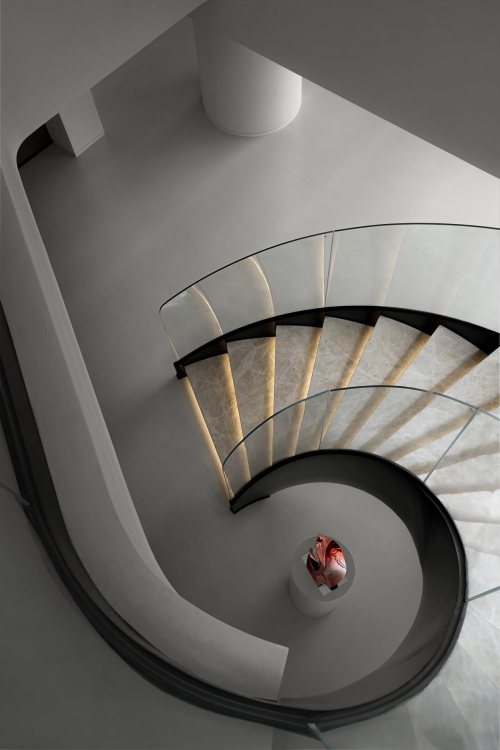 将现代极简主义与古典韵味混搭,挑高客厅的格局设计,明亮开阔,创造出一种全新不规则的时尚空间。天然石材墙面与金属质感元素相互映衬,保留材质的原生肌理。