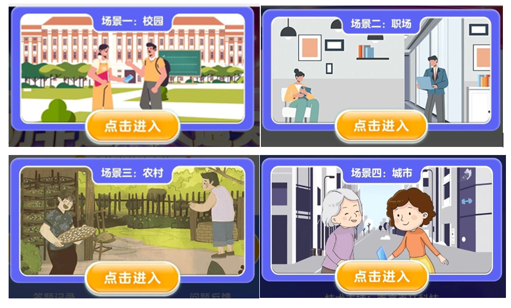 涵盖校园、职场、城市、农村四大场景(以下为参与界面截图)。
