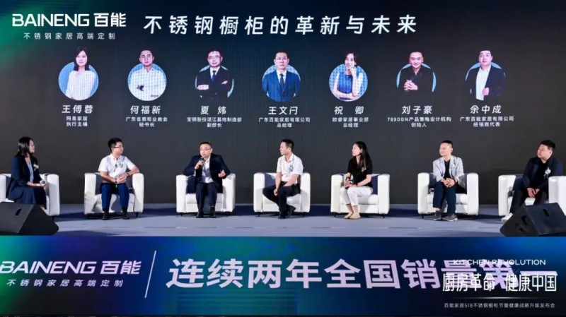 广东百能家居有限公司王文闩、网易家居执行主编王傅蓉、宝钢股份湛江基地制造部副部长夏炜、广东省橱柜业商会秘书长何福新、欧睿家居事业部总经理祝卿、789DDN产品策略设计机构创始人刘子豪、百能经销商代表余中成参与《不锈钢橱柜的革新与未来》高峰论坛,嘉宾们共同围绕不锈钢橱柜的革新方向与未来发展趋势展开深入探讨,从环保基材的属性分析到新材料的突破性应用,从个性化定制需求的精准满足到全屋健康场景的生态化构建,嘉宾们通过跨界对话、案例拆解与趋势预判,以前瞻性洞察为不锈钢橱柜产业的可持续高质量发展注入思想动能。