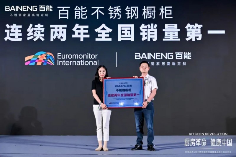 发布会上,广东百能家居有限公司副总经理胡勇、欧睿家居事业部总经理祝卿参与百能不锈钢橱柜连续两年全国销量第一授牌仪式,这一殊荣不仅是对百能家居产品力、工艺水准、设计创新与服务体系全方位领先的权威认证,更标志着其以“销量冠军”的硬核实力,强势领跑不锈钢家居市场!