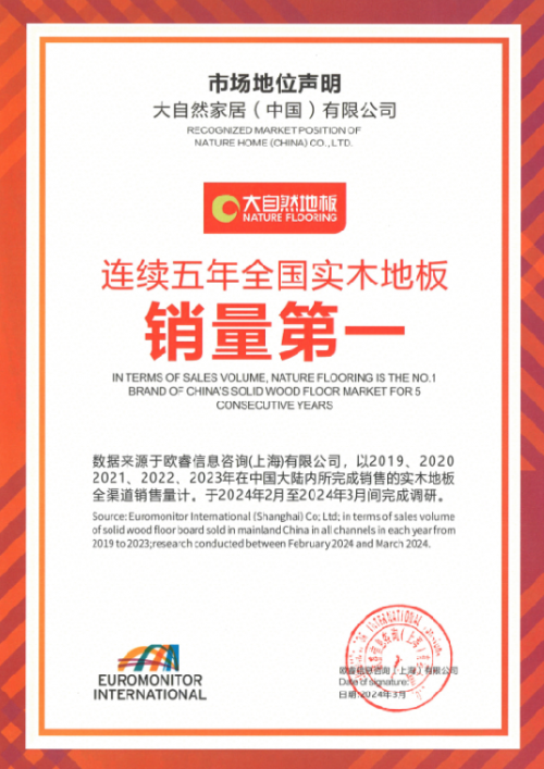欧睿咨询作为世界先进的权威市场调查机构,所出示的调研数据具有行业认可的公信力。据欧睿咨询发布的数据显示,大自然家居的实木地板在过去五年中一直保持着国内市场的领先地位,稳坐“全国实木地板销量第一”宝座,展现出了强大的市场竞争力和品牌影响力。